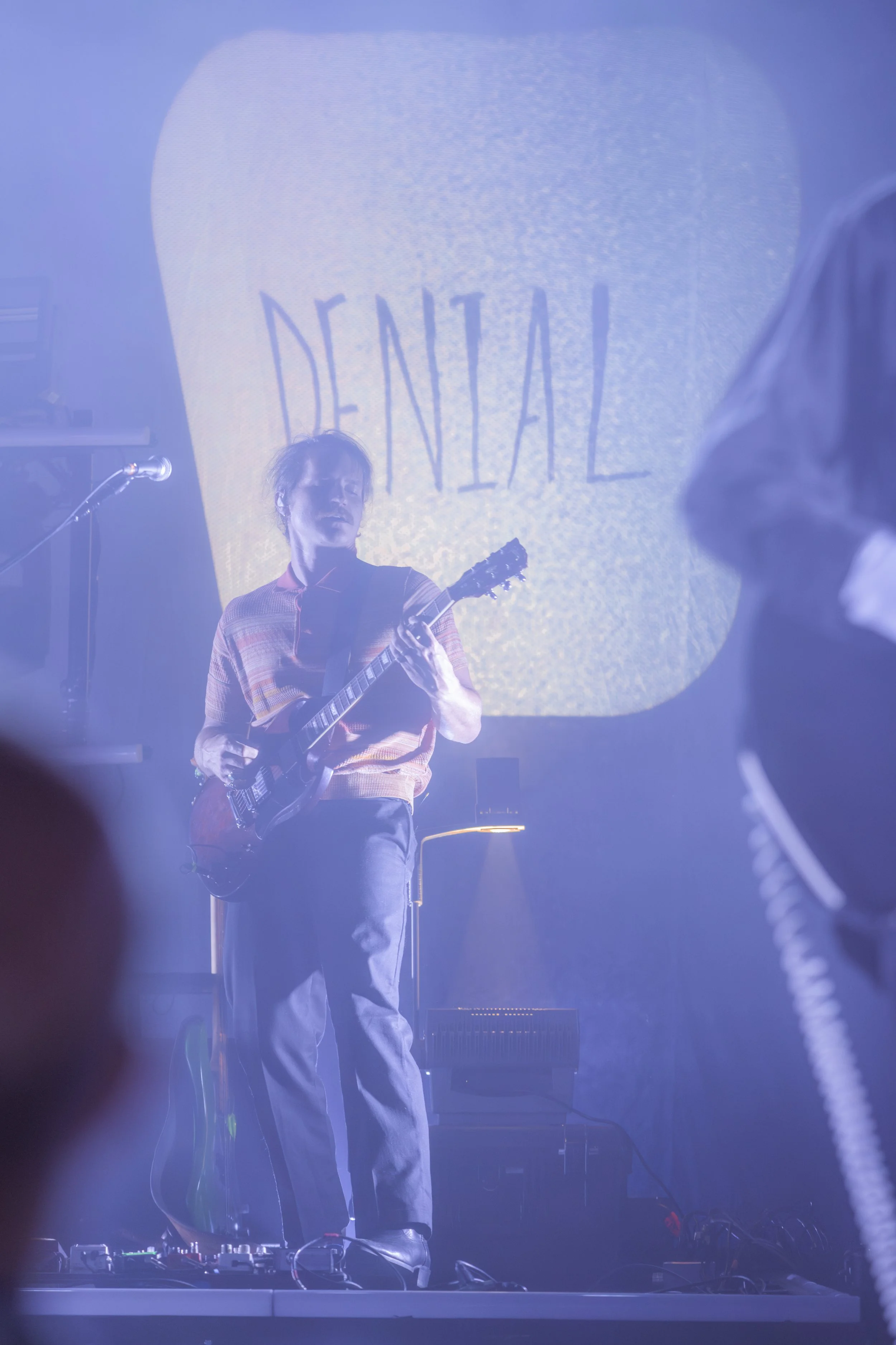 A person playing guitar on stage with a large screen behind them displaying the word 'DENTAL'. View fullsize