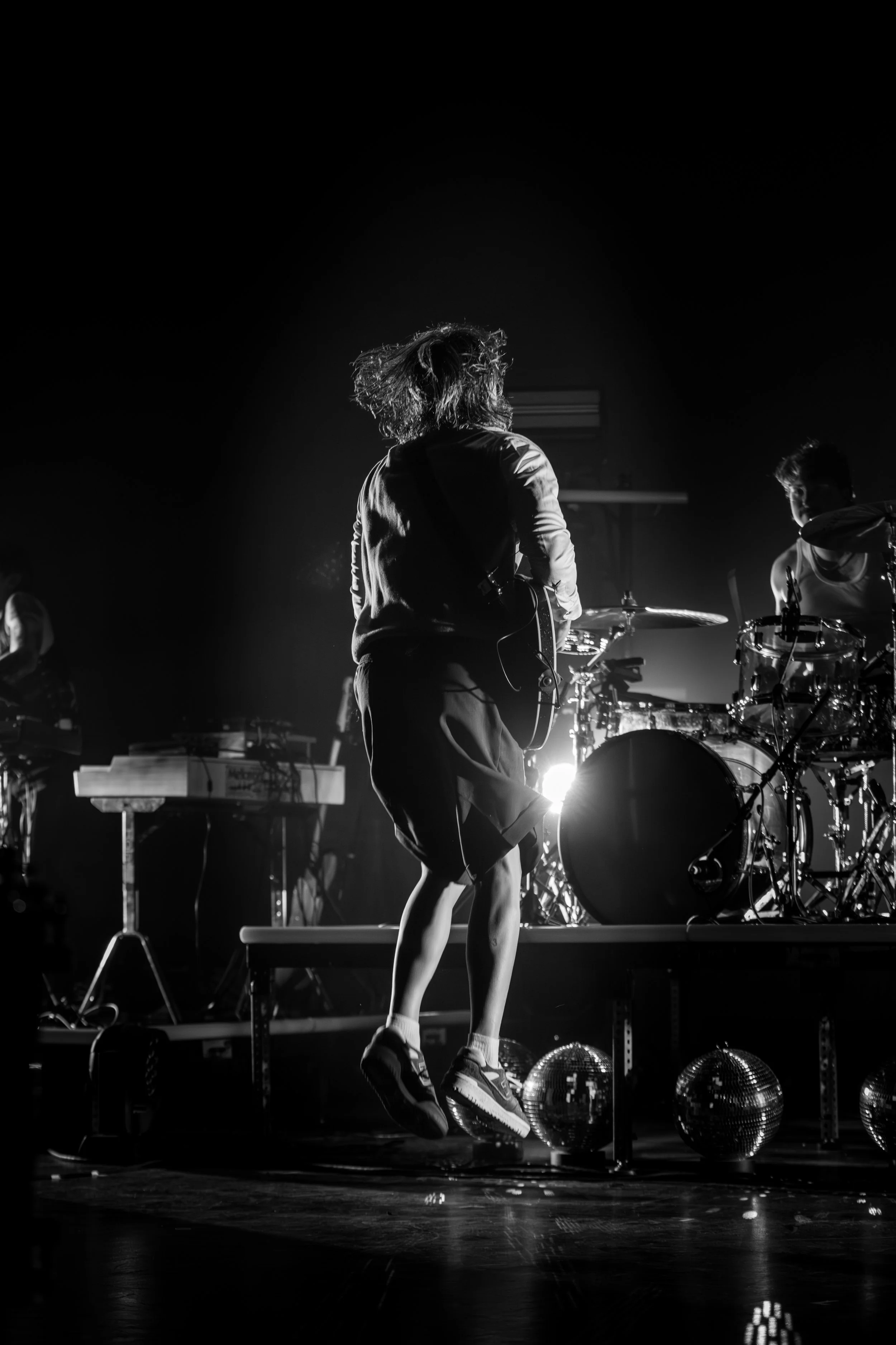 A black and white photo of a musician jumping on stage while playing an electric guitar, with a drummer in the background during a concert.