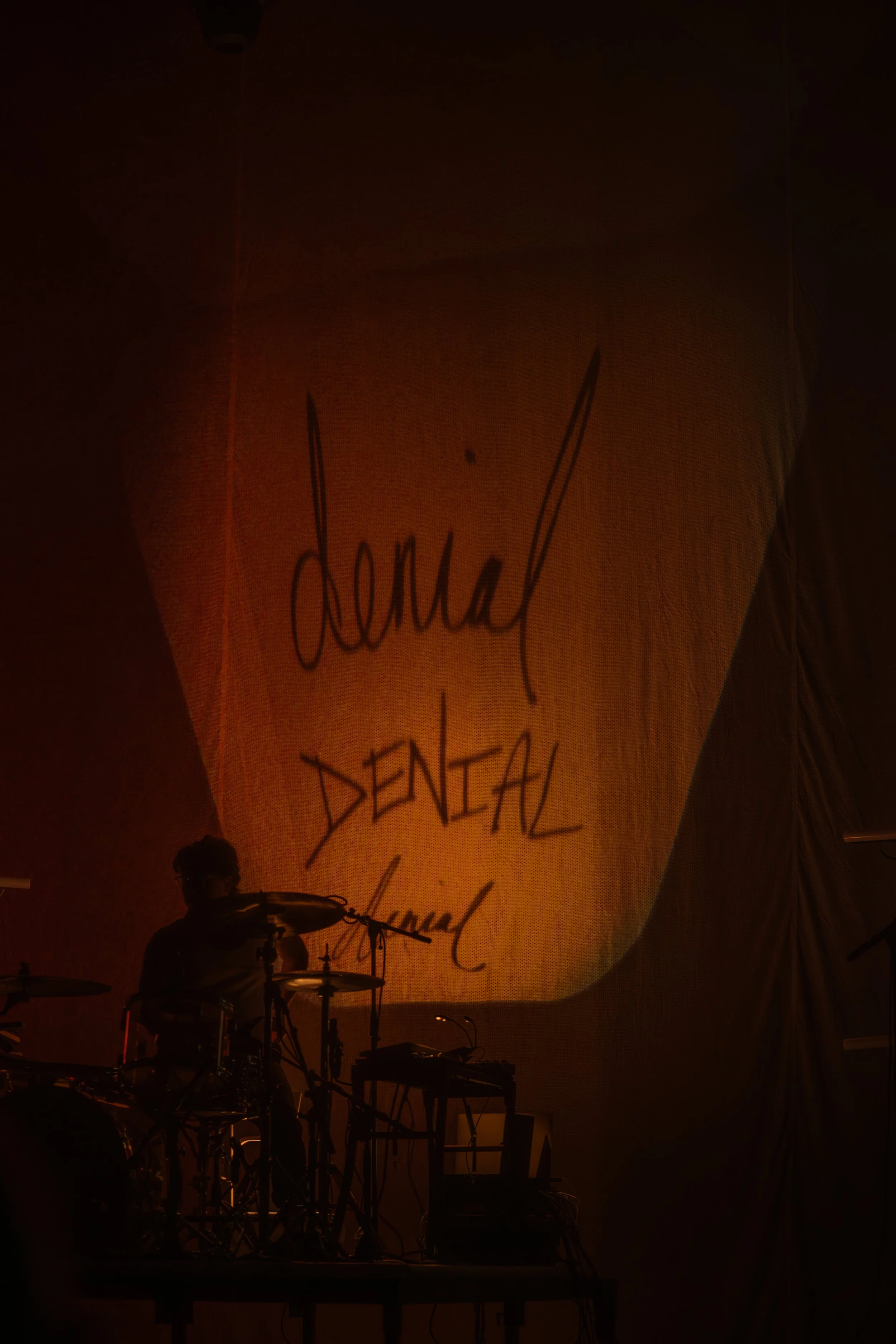 A person playing drums on stage with a large projected sign reading 'dental DENTAL' behind them.