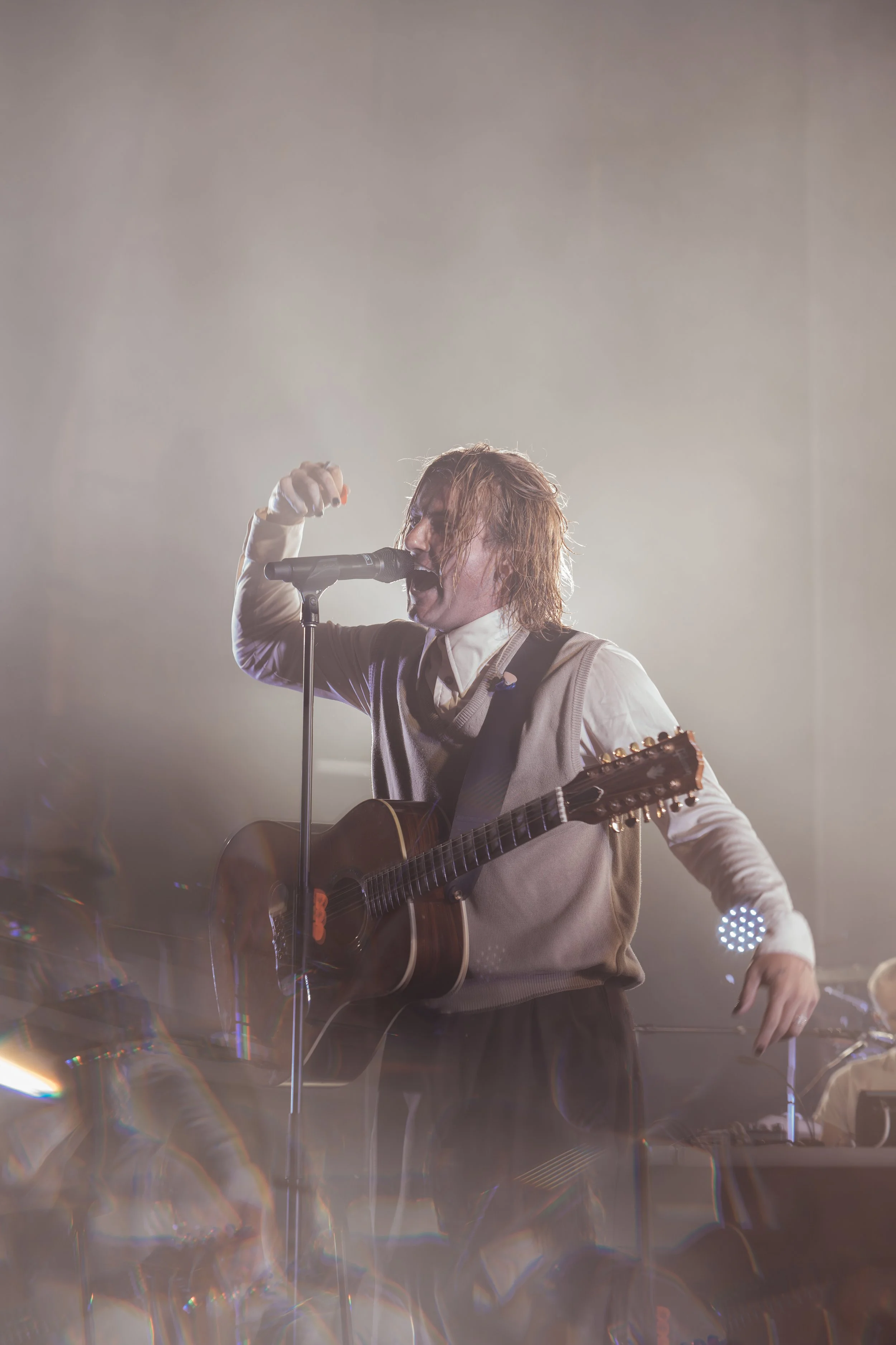 A person with red hair singing into a microphone while playing an acoustic guitar on stage, illuminated by bright stage lights. View fullsize