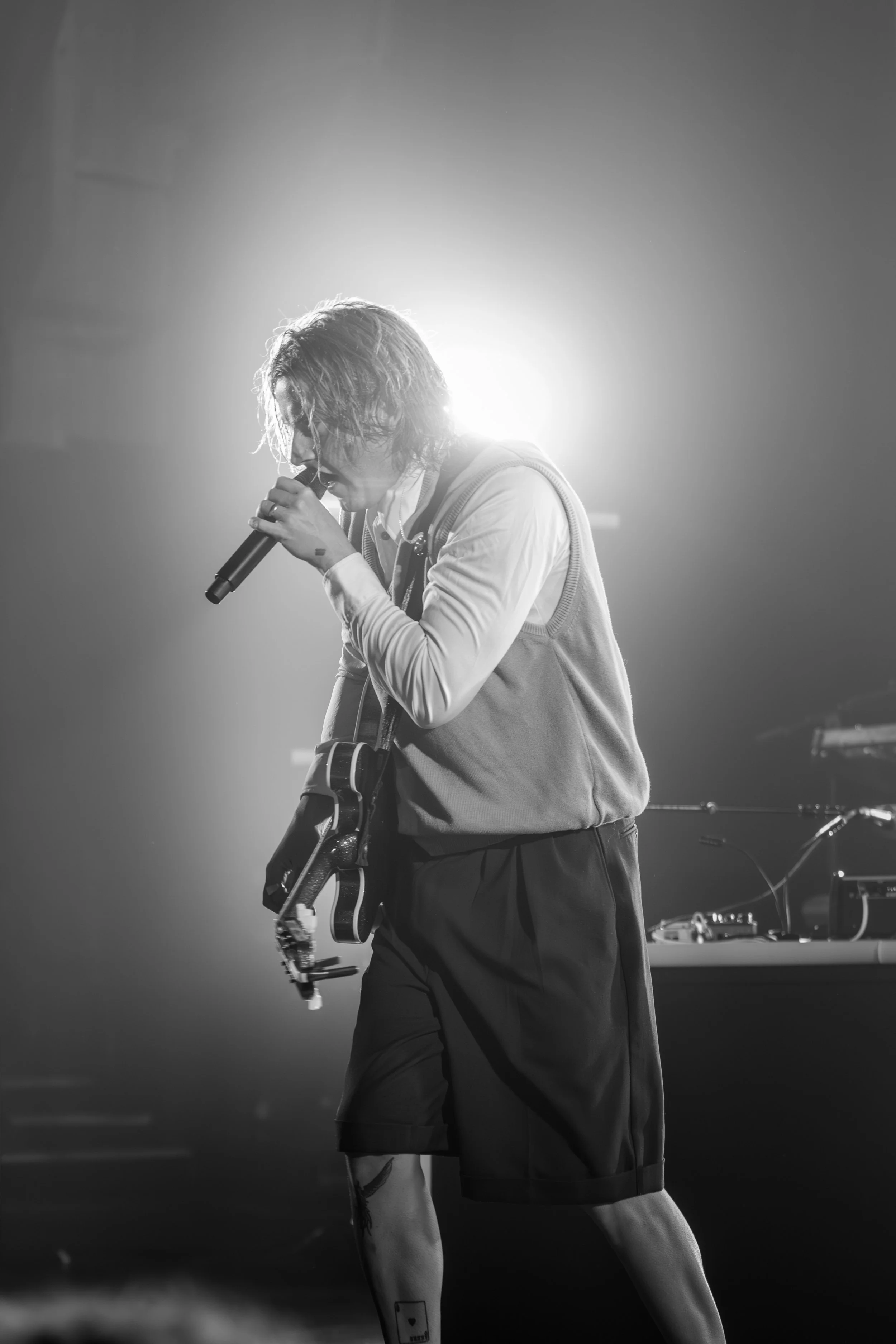 A black and white photo of a male singer performing on stage with a microphone, wearing a hoodie and shorts, backlit by bright lighting.