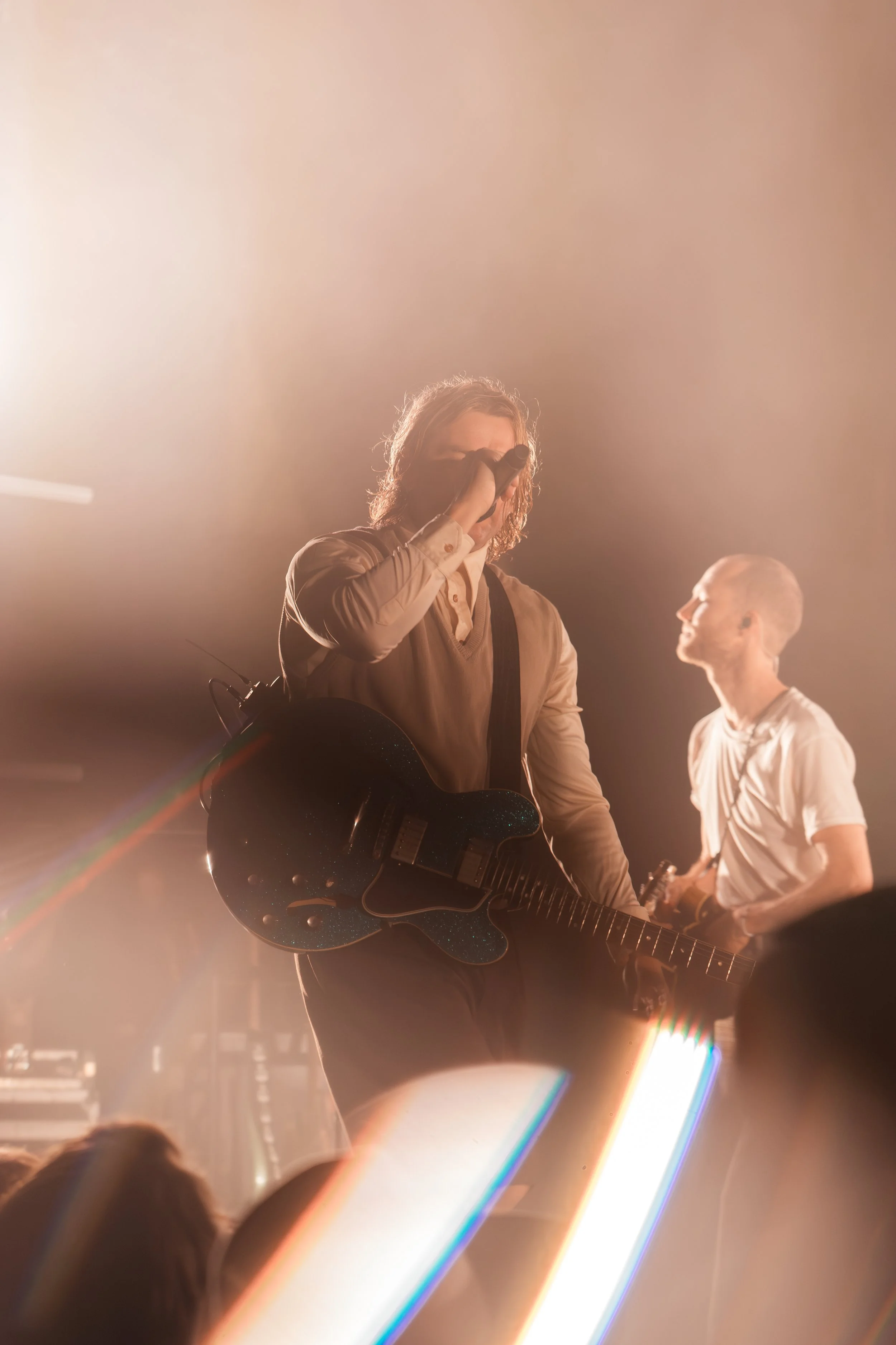 Musician with curly hair, wearing a beige shirt and a brown vest, holding a sparkly black guitar, wiping sweat from his face on stage with smoky lighting. Another person with short hair and a white t-shirt is visible in the background, also playing g
