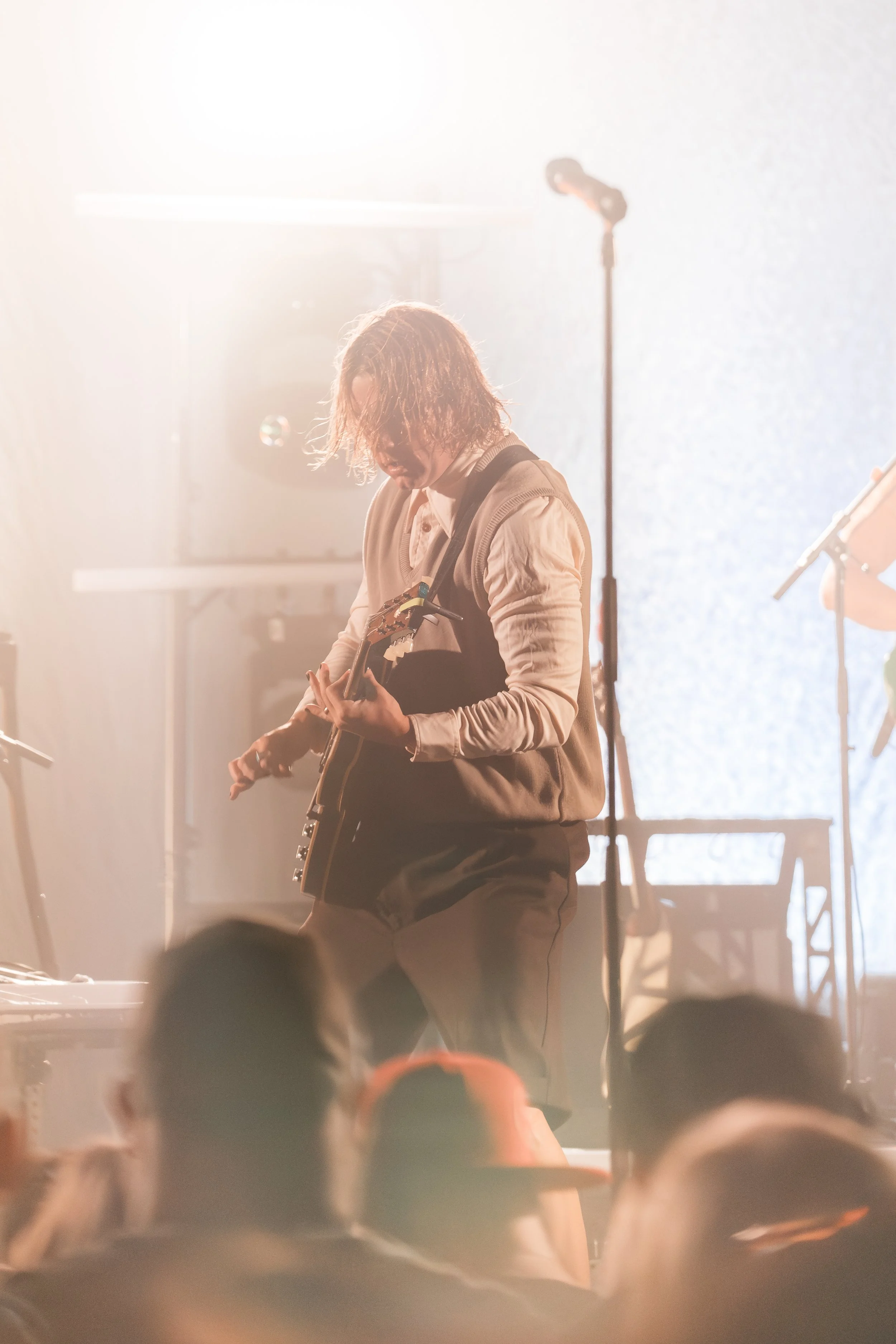 A musician playing an electric guitar on stage during a live performance, with bright stage lights illuminating behind him.